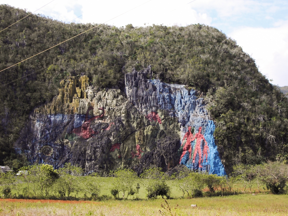 Zo, met hun hand wrijvend aan hun kin, duiden de Cubanen de “grote leider” zelf aan. Er zijn maar weinig landen op de aarde waar één man zo lang zoveel invloed heeft kunnen uitoefenen op het volk en het land zelf. Tegenwoordig is Castro te oud en fragiel om nog te regeren en heeft zijn broer het stokje overgenomen. En hoewel er natuurlijk van alles gezegd kan worden over de mensenrechten en beleid van deze “man met de baard”, goed of slecht. Er valt niet te ontkennen dat veel van de toeristische plaatjes die wij kennen van het Cuba direct veroorzaakt worden door het communistische beleid van deze vijandelijke buur van de Verenigde Staten. Google Cuba op afbeeldingen en geheid dat je een flink aantal foto’s krijgt van prachtige oude auto’s. Direct gevolg van het verbod wat de Cubanen werd opgelegd om alleen nog maar auto’s van voor de coup te verkopen en onderhouden en het aanhoudende handelsembargo van de Amerikanen. Hoewel er in deze situatie langzaamaan verandering begint te komen. Toeristen eisen veilig vervoer en daarmee de komst van nieuwer model af. Eigenaar van de auto valt altijd af te lezen van het nummerbord. Geel is voor de Cubanen zelf en blauw voor de auto’s die zijn aangeschaft door de regering. Meestal om te worden verhuurd aan toeristen. Cuba is ook een land zonder veel hoogbouw. Grote hotelketens en megalomane kantoorgebouwen zul je hier niet aantreffen. Ook dit is uiteraard weer inherent aan het communistische regime. Tegenwoordig worden er wel meer van dit soort grotere hotels gebouwd. Grote hoeveelheden hoogbouw bij elkaar zul je echter niet zo heel veel treffen. De revolutie heeft ook de kunst danig beïnvloedt. Cuba had altijd al een grote invloed op de inspiratie van verschillende artiesten. Bizet met zijn Habanera, Guantanamera, zo’n beetje gecoverd door iedere zanger in de wereld, en uiteraard Hemingway met zijn “oude man en de zee”. Na de revolutie kreeg de kunst een extra dimensie met kunst die direct geïnspireerd werd door zowel verzet als propaganda voor het nieuwe regime. Fotografie en kunst werden een geliefd middel om de boodschap aan de man te brengen. Toen Castro aan de macht kwam kreeg kunst nog meer aandacht. Kunstenaars kregen meer vrijheid en hierdoor floreerde de kunst. Castro zelf liet enkele enorme muurschilderingen aanbrengen door Cuba.